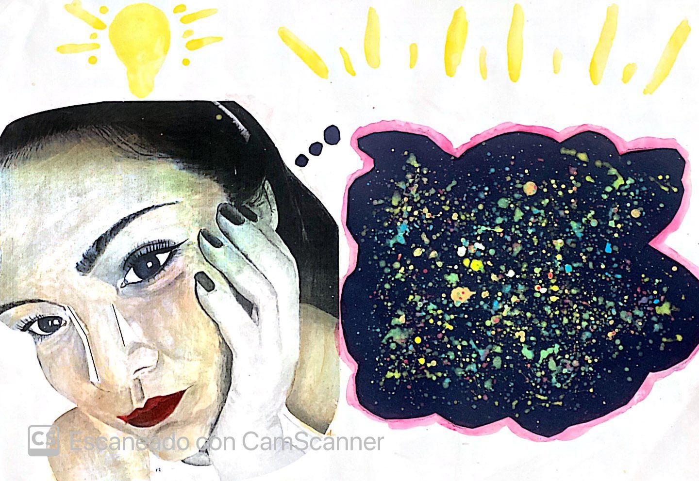 Para realizar mi autorretrato he comenzado pegando una foto mía en blanco y negro en una cartulina blanca de tamaño A3. Tras pegar la fotografía, coloreé con lápices los labios porque a mi siempre me encanta pintarme los labios de rojo. A continuación delineé con recortes lineales la zona de la nariz y el surco del labio, para así marcarlas más. Por otra parte, también pinte el color de la piel con acuarelas, aunque en la imagen apenas se aprecia. Después de realizar estos retoques en la fotografía, pasé a decorar el resto de la cartulina. Hice un recorte con una cartulina azul marino en forma de nube de pensamiento, y también recorte tres círculos para hacer la unión con la nube. Cuando pegué la nube de pensamiento, realicé muchas mezclas con los colores primarios de las temperas y ejecuté las técnicas de lanzamiento de pintura (con pincel y con cepillo de dientes). Además, por fuera de la nube hice un delineado de color rosa con el pincel, para así resaltar más el contraste de color. Por último, a nivel decorativo realicé unas líneas amarillas y dibujé la forma de una bombilla.